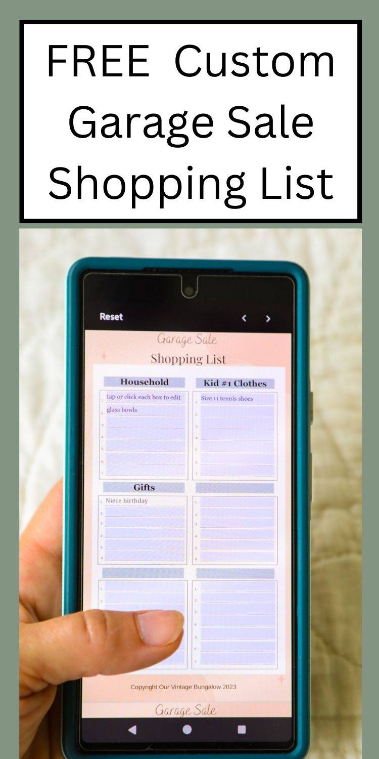 Key Point: This kind of shopping takes planning, intentionality and patience. It is a crockpot sort of purchasing rather than Amazon Prime purchasing. (Don’t get me wrong, I love Amazon Prime too!) To make your own shopping plan, get my FREE fully Customizable Garage Sale Shopping List you can download to your mobile phone for an easy access. Make the list on your phone and have it with you whenever you see a sale!